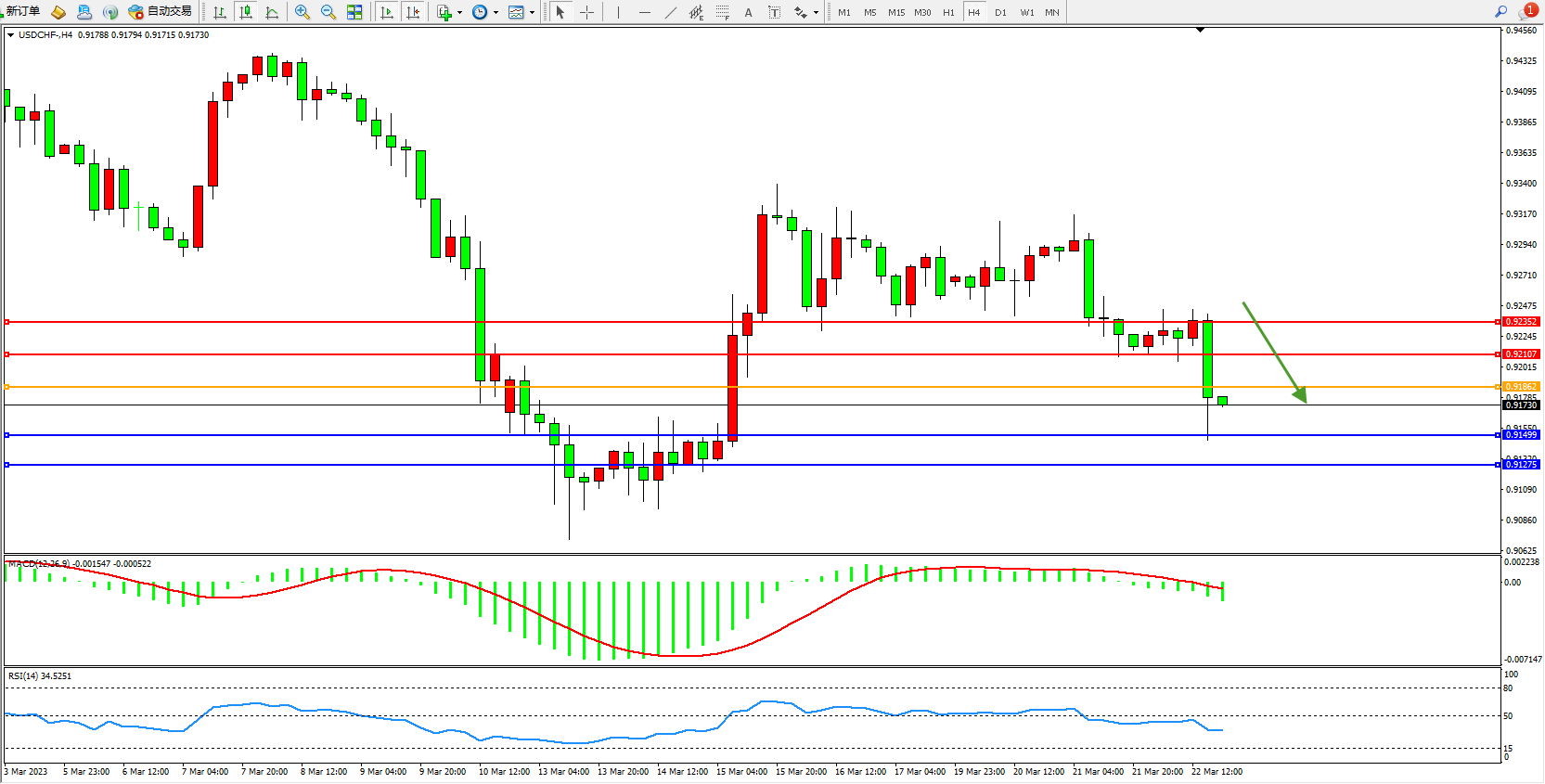 美元瑞郎USDCHF——4小时K线图显示: