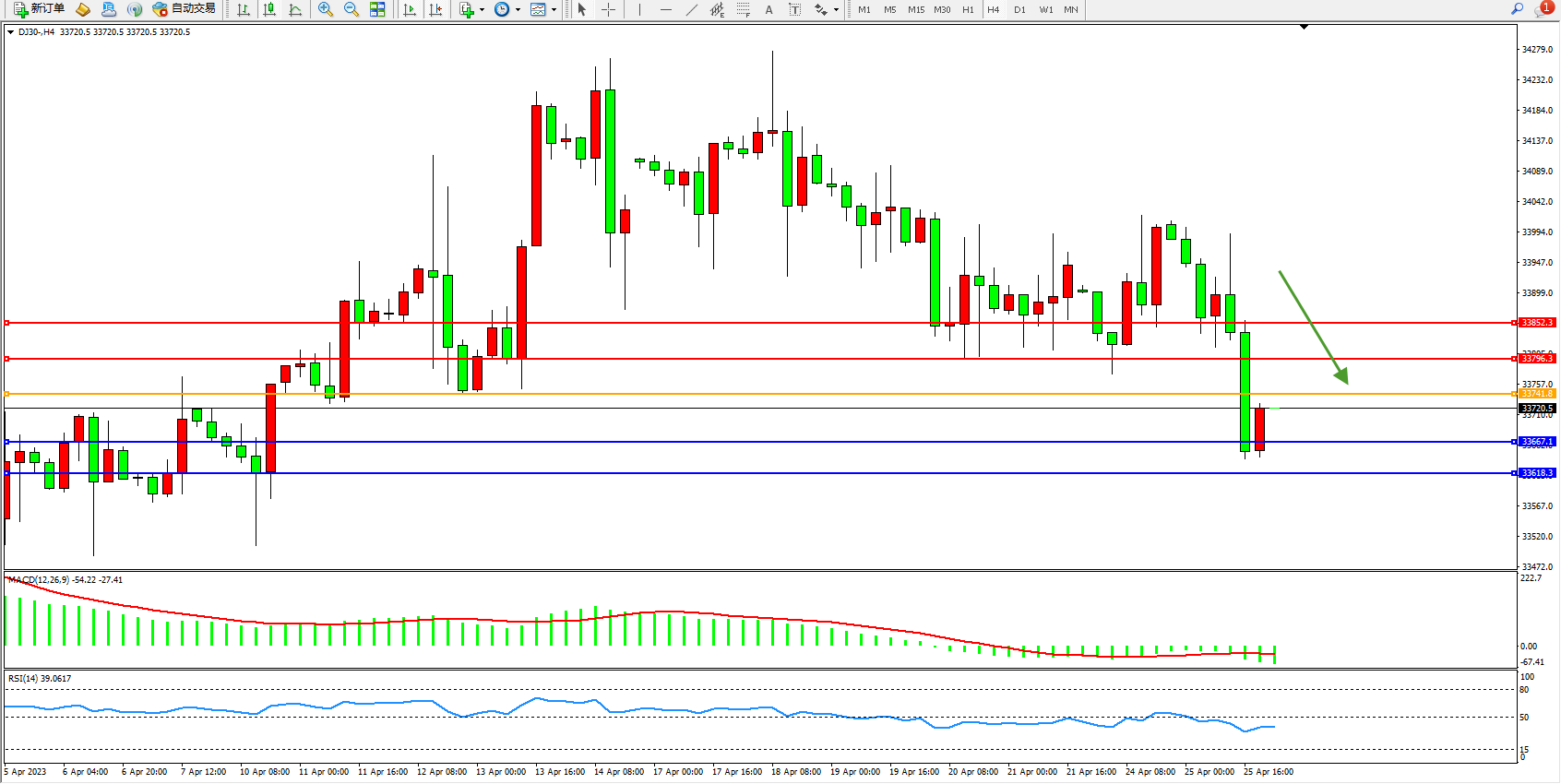 道琼斯指数DJ30——4小时K线图显示: