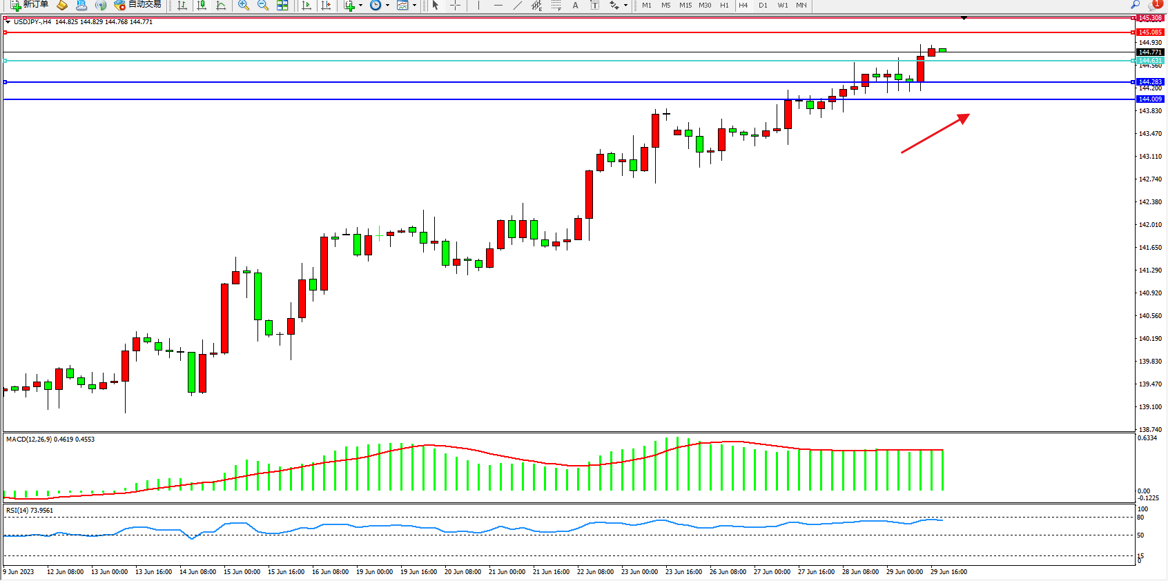 交易策略:144.631上方看涨,目标145.065 145.308