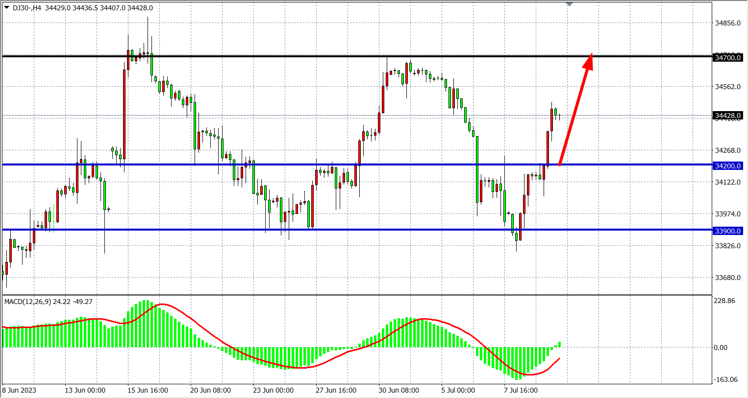 4小时图看,道指继续走高上破34200,MACD量能开始上穿零轴,行情有望延续涨势,下方支撑34200-33900,上方阻力34700-35000。