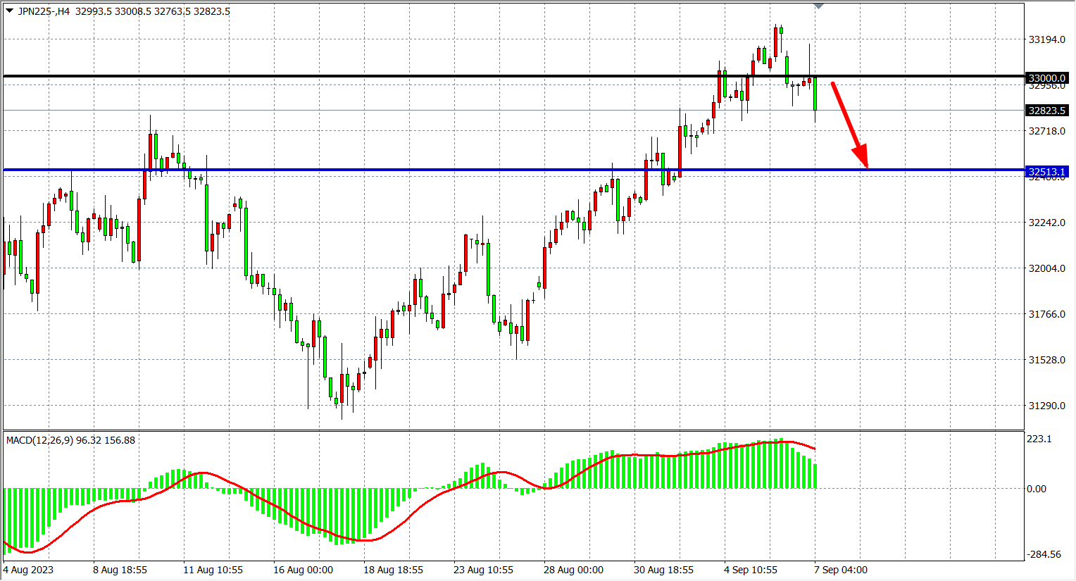 4小时图看,日经指数继回落33000之下,MACD量能在零轴上开始缩量,阻力关注33000附近,下方看32500-32200附近。