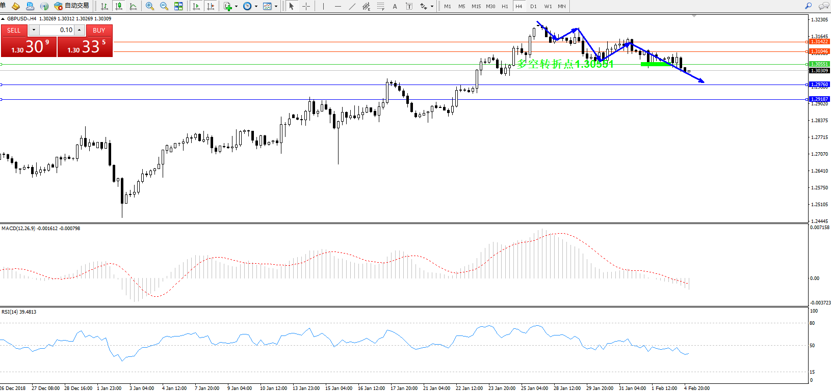 交易策略:1.30551下方看跌,目标1.29760、1.29187