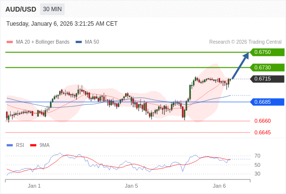在 0.6685 之上,看涨,目标价位为 0.6730 ,然后为 0.6750 。