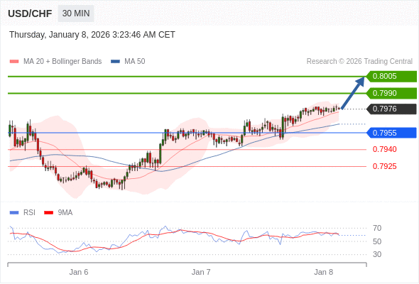 在 0.7955 之上,看涨,目标价位为 0.7990 ,然后为 0.8005 。