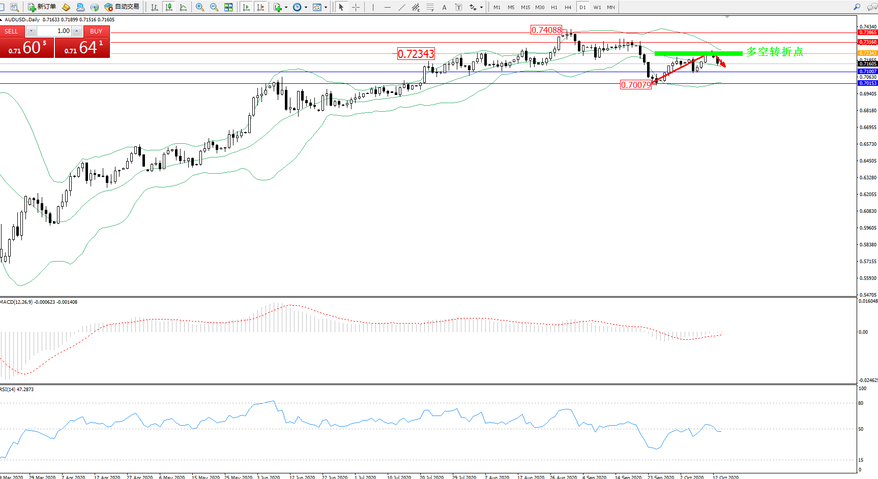 技术点评:高位空头点弱势震荡回撤至0.70079位置后得到短暂支撑开始缓慢上移,弱势震荡至中上轨区间徘徊,布林带指标呈收口走势中,有再度下破中轨迹象,关注上轨附近转折点,MACD指标处于空头区域低位弱势上移至0轴线附近徘徊,RSI指标低位多头动力持续震荡回升至50均衡线附近徘徊中;