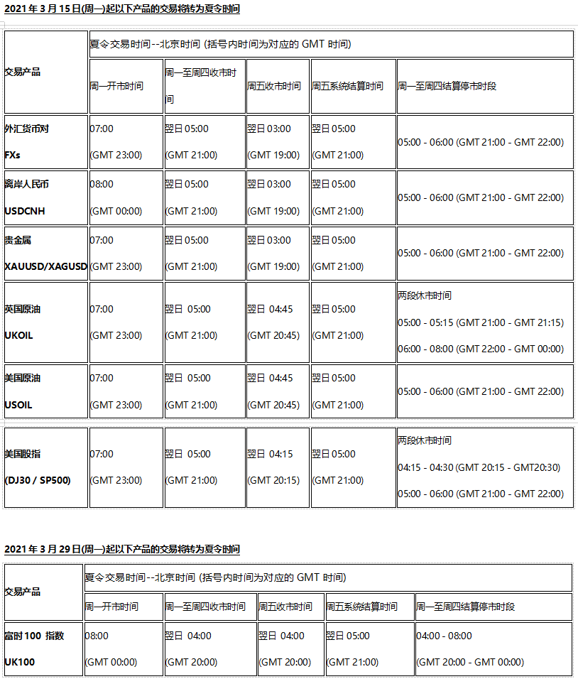 欧美市场夏令时交易时间调整通知