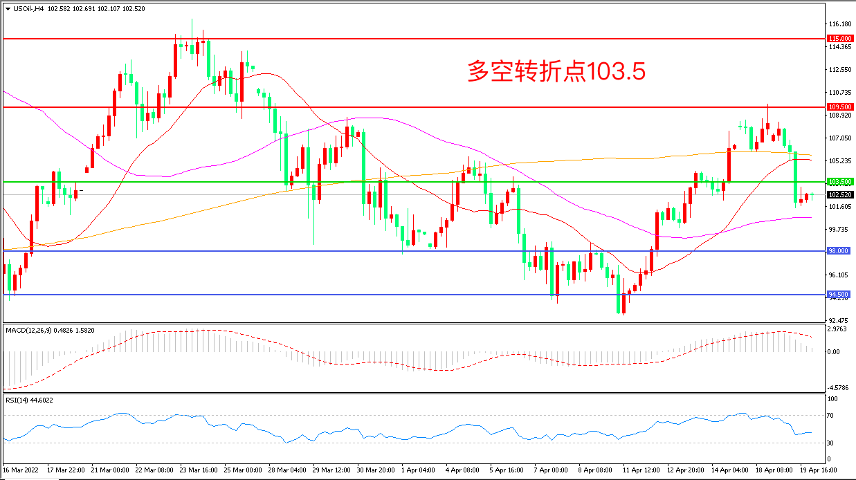 周二(4月19日),美联储官员的偏鹰派表态以及IMF下调全球经济增速让投资者变得更加谨慎,市场风险情绪降温,美国WTI原油大幅“跳水”,收报102.55/桶。周三(4月20日)凌晨公布的API数据意外减少449万桶,如果晚间EIA数据与此表现一致,将有利于油价企稳,俄乌重新开战的背景下,短期内油价易涨难跌。