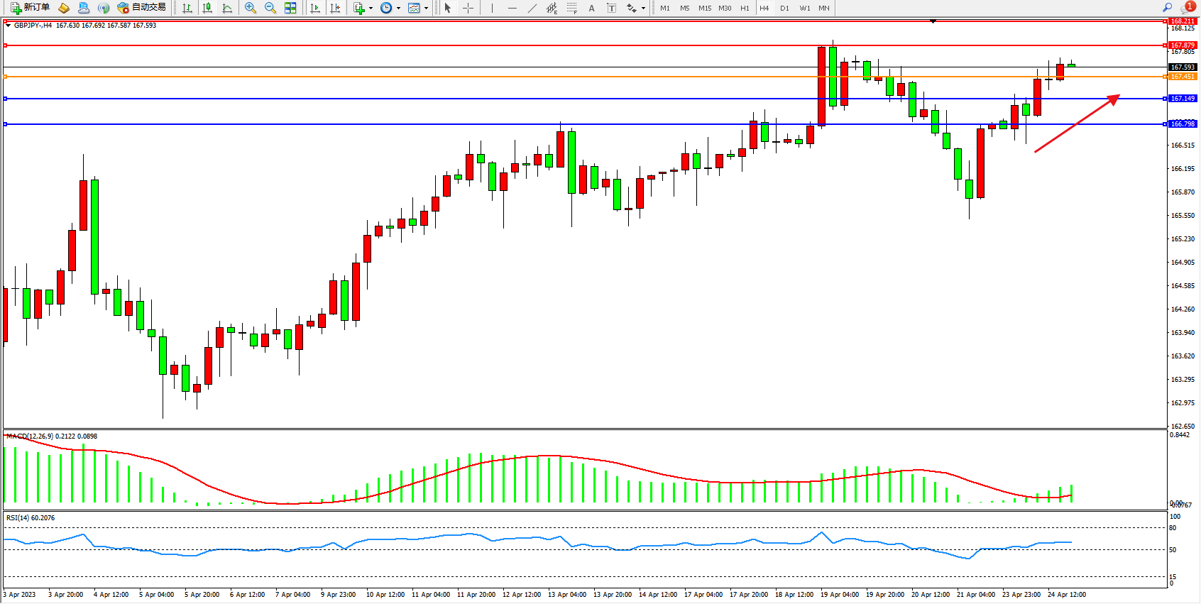 交易策略:167.451上方看涨,目标167.879  168.211