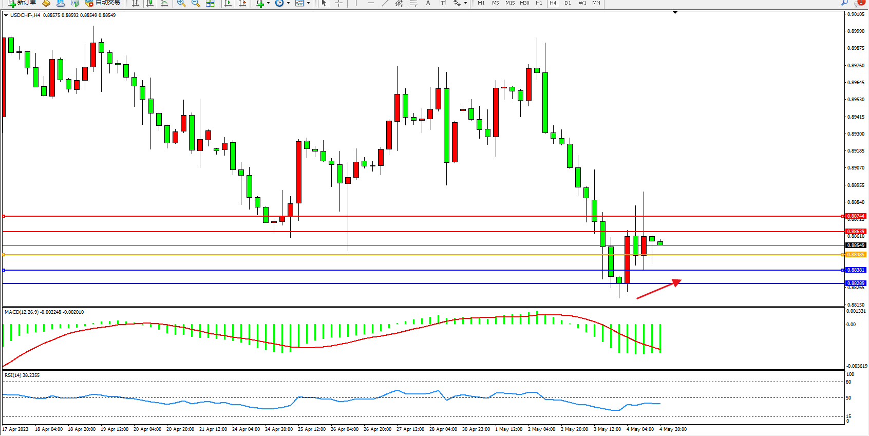 美元瑞郎USDCHF——4小时K线图显示: