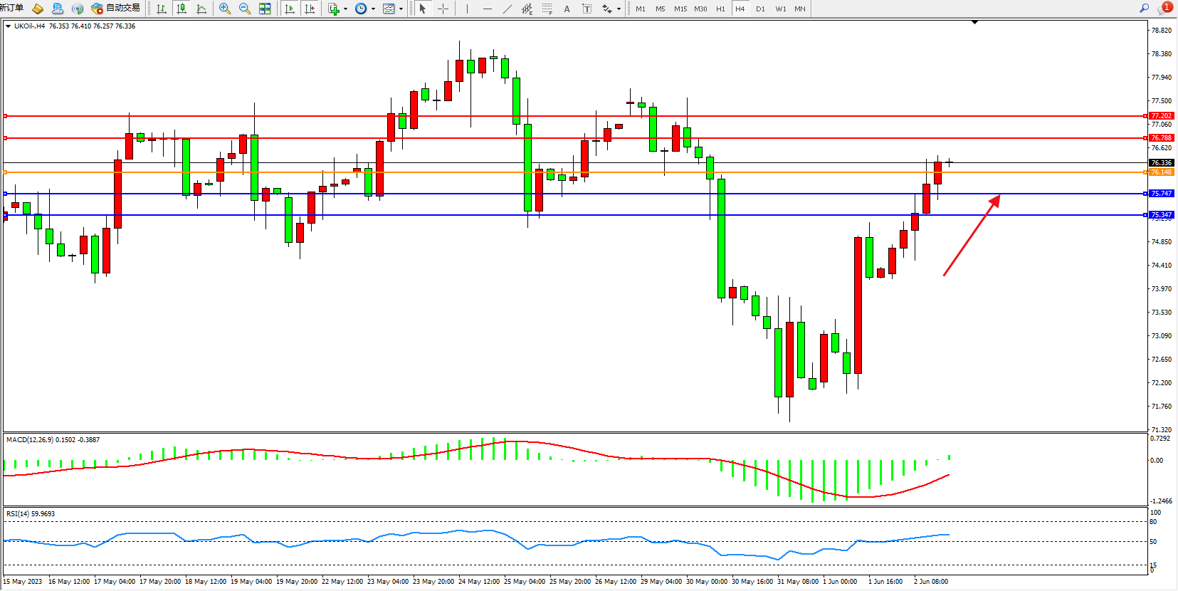 交易策略:76.148上方看涨,目标76.788  77.202