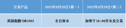 因应2023年8月28 日为英国市场假期,本公司以下产品的交易时间将于假期期间作以下安排,敬请留意。